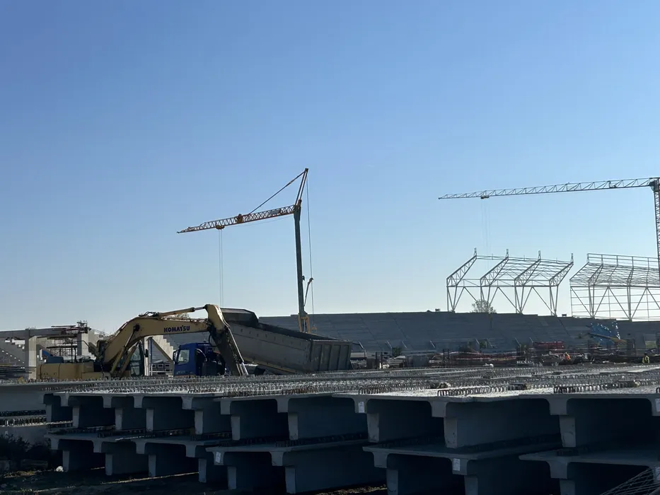 Progres însemnat la „Micul OZN” de la Târgoviște: pe jumătate din arenă s-au pus gradenele și se montează acoperișul!
