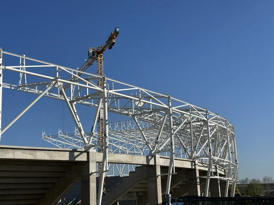 Progres însemnat la „Micul OZN” de la Târgoviște: pe jumătate din arenă s-au pus gradenele și se montează acoperișul!