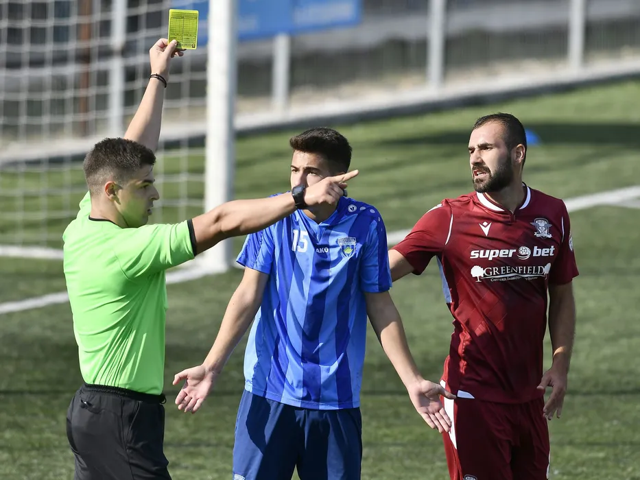 Arbitrul central Madalin Marinescu ii acorda un cartonas galben lui Alexandru Cirlig sub privirea lui Alexandru Dandea in meciul de fotbal dintre Progresul Spartac Bucuresti si Rapid Bucuresti, contand pentru Cupa Romaniei, disputat pe stadionul Progresul Spartac din Bucuresti, marti 20 octombrie 2020. © FOTO:Razvan Pasarica/SPORT PICTURES