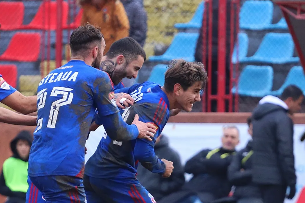 Fotbaliștii steliști Adrian Ilie, Roberto Gimenez Sierra se bucură după un gol marcat de Rareș Maeschi în meciul de fotbal dintre CSC 1599 Șelimbăr și Steaua București, contând pentru Liga 2 Casa Pariurilor, desfășurat pe Stadionul Măgura din Cisnădie, duminică 1 decembrie 2024. © FOTO: Valentin MACREA/SPORT PICTURES