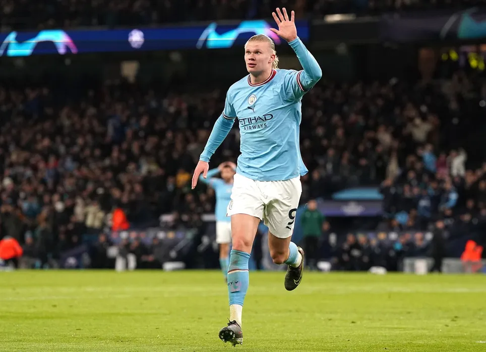 Manchester City's Erling Haaland celebrates scoring their side's sixth goal of the game and his fifth goal during the UEFA Champions League round of sixteen second leg match at Etihad Stadium, Manchester. Picture date: Tuesday March 14, 2023.,Image: 762807850, License: Rights-managed, Restrictions: Use subject to restrictions. Editorial use only, no commercial use without prior consent from rights holder., Model Release: no