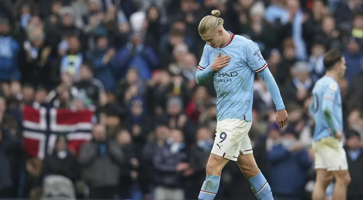 Manchester City's Erling Haaland goes off the field as he is substituted during the English Premier League soccer match between Manchester City and Wolverhampton at the Etihad Stadium in Manchester, England, Sunday, Jan. 22, 2023. (AP Photo/Dave Thompson)