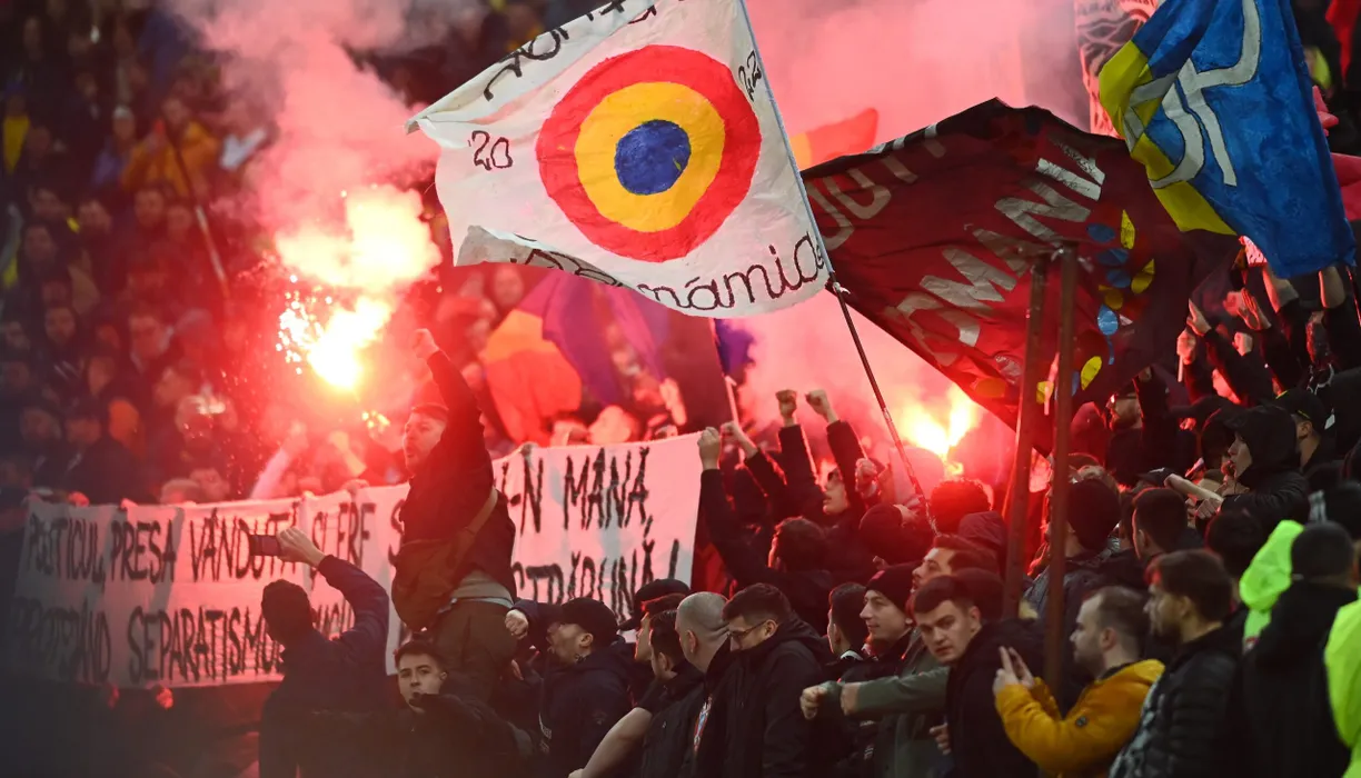 Torte si fumigene in peluza la meciul de fotbal dintre Romania si Belarus, din cadrul preliminariilor Campionatului European 2024, desfasurat pe Arena Nationala, marti 28 martie 2023. © FOTO:Razvan Pasarica/SPORT PICTURES