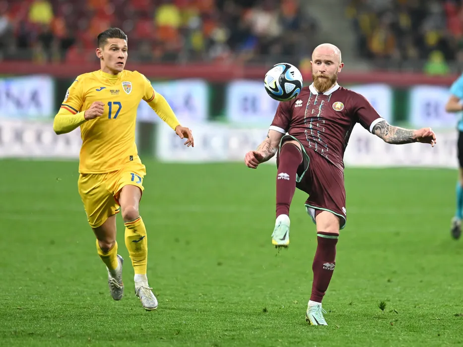 Alexandru Mihai Dobre si Ruslan Khadarkevich in meciul de fotbal dintre Romania si Belarus, din cadrul preliminariilor Campionatului European 2024, desfasurat pe Arena Nationala, marti 28 martie 2023. © FOTO:Razvan Pasarica/SPORT PICTURES