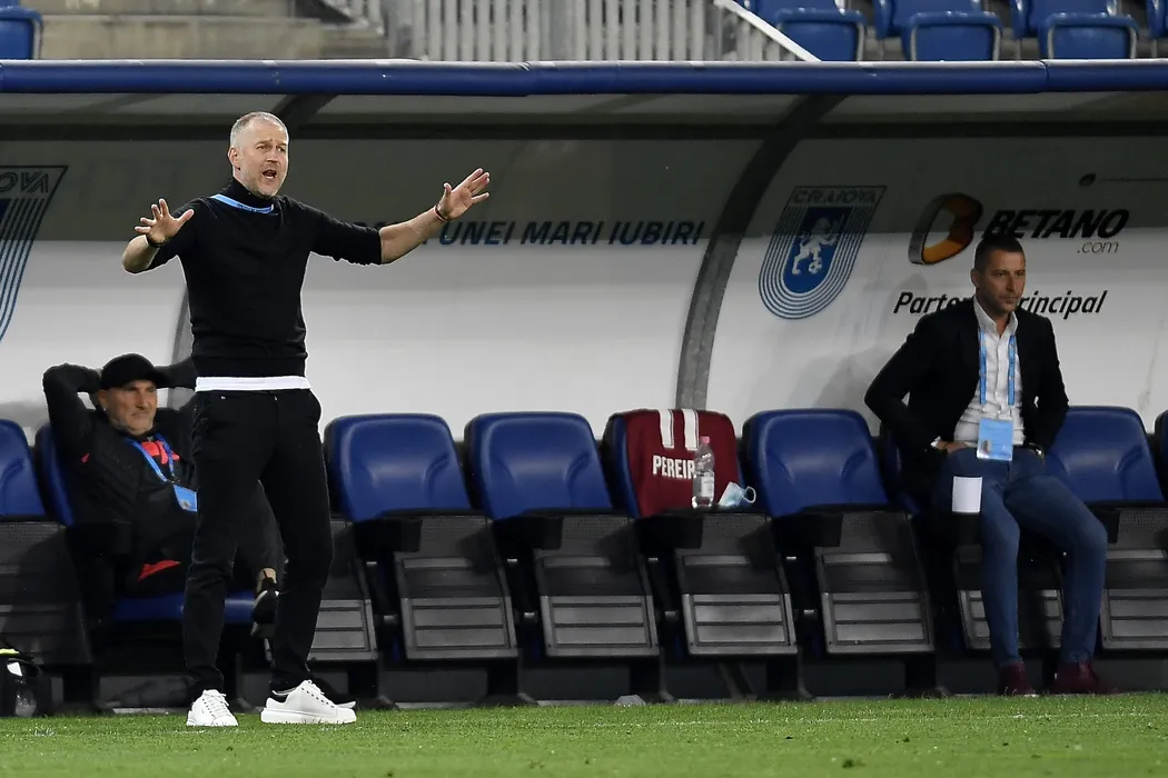 Eduard Iordanescu, antrenorul echipei CFR Cluj, urmareste meciul de fotbal contra formatiei Universitatea Craiova din etapa 8 a play-off-ului Ligii 1, disputat pe stadionul Ion Oblemenco din Craiova, sambata, 15 mai 2021. ALEX NICODIM / MEDIAFAX FOTO