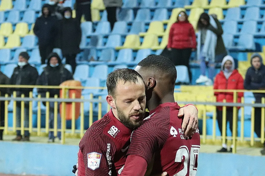 Cristian Daniel Negut si Hadi Sacko se bucura dupa un gol marcat in meciul de fotbal dintre Gaz Metan Medias si CFR Cluj, contand pentru Liga 1 Casa Pariurilor, desfasurat pe Stadionul Municipal din Medias, sambata 12 februarie 2022. © FOTO:Macrea Valentin/SPORT PICTURES