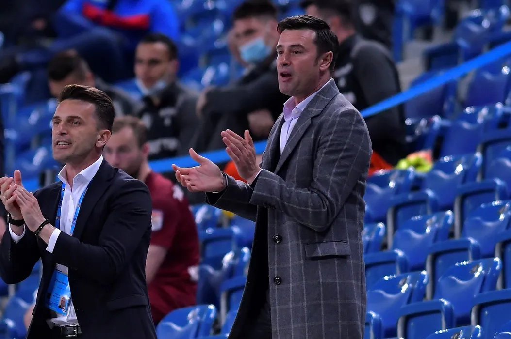 Marian Copilu si Marius Bilasco aplauda din tribuna un nou gol clujean in meciul de fotbal dintre Universitatea Craiova si CFR Cluj, contand pentru Play-off-ul Ligii 1 Casa Pariurilor, desfasurat fara spectatori pe Stadionul Ion Oblemenco din Craiova, sambata 15 mai 2021. © FOTO:Razvan Pasarica/SPORT PICTURES