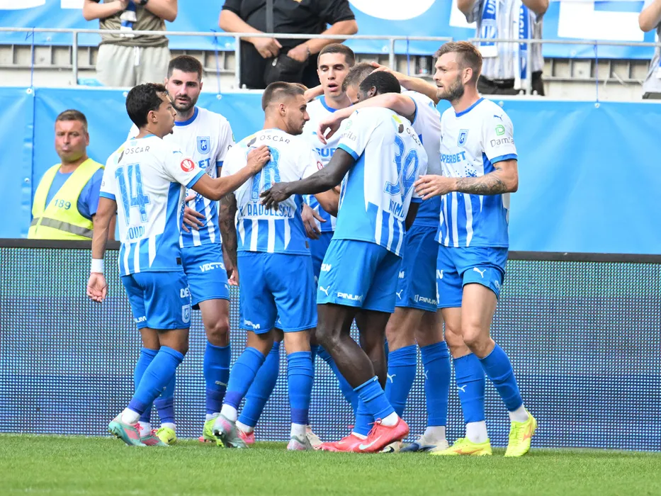 Bucurie a fotbalistilor craioveni Lyes Hafid Houri, Florin Bogdan Stefan, Mihnea Gabriel Radulescu, Nikola Stefanovic si Alexandru Cretu dupa un gol marcat de catre Oleksandr Romanchuk in meciul dintre Universitatea Craiova si FC Hermannstadt, contand pentru Superliga Superbet, desfasurat pe Stadionul Ion Oblemenco din Craiova, duminica 10 august 2025. © FOTO:Razvan Pasarica/SPORT PICTURES