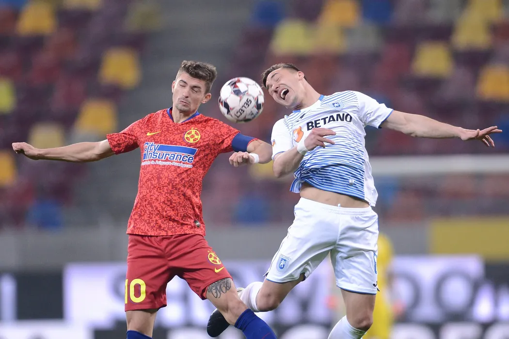 Florin Tanase (S), de la FCSB, lupta pentru balon cu Alexandru Mateiu (D), de la Universitatea Craiova, in timpul meciului de fotbal din etapa a II-a a play-off-ului Ligii 1, disputat pe Arena Nationala din Bucuresti, duminica, 8 martie 2020. ALEXANDRU DOBRE / MEDIAFAX FOTO