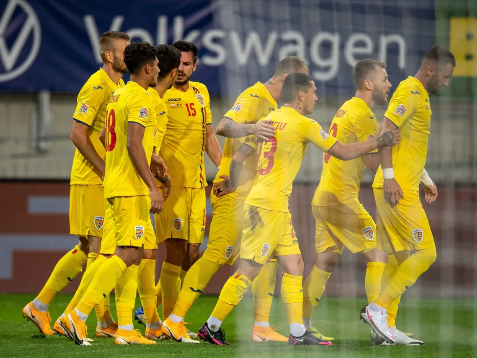 Bucurie a fotbalistilor romani cu Andrei Burca, Nicolae Stanciu, Alexandru Maxim si Dragos Grigore in meciul de fotbal dintre Austria si Romania, contand pentru Liga Natiunilor, desfasurat fara spectatori pe Stadionul Wörthersee din Klagenfurt, luni 7 septembrie 2020. © FOTO:SPORT PICTURES