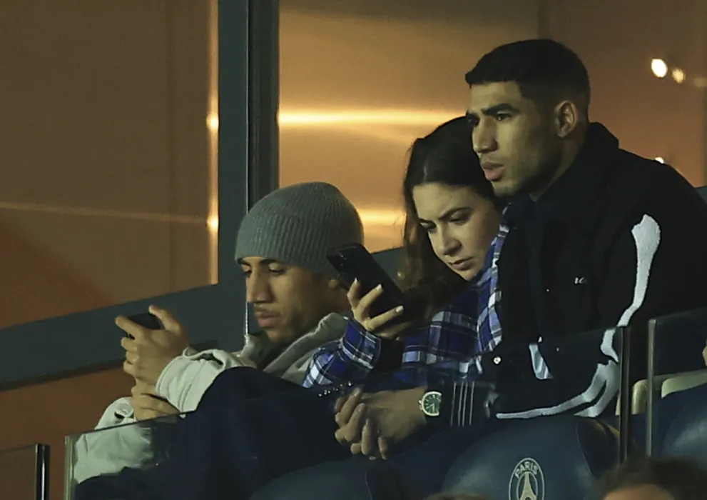 PSG's Achraf Hakimi, right, watches the French League One soccer match between Paris Saint-Germain and Nantes at the Parc des Princes in Paris, Saturday, March 4, 2023. (AP Photo/Aurelien Morissard)