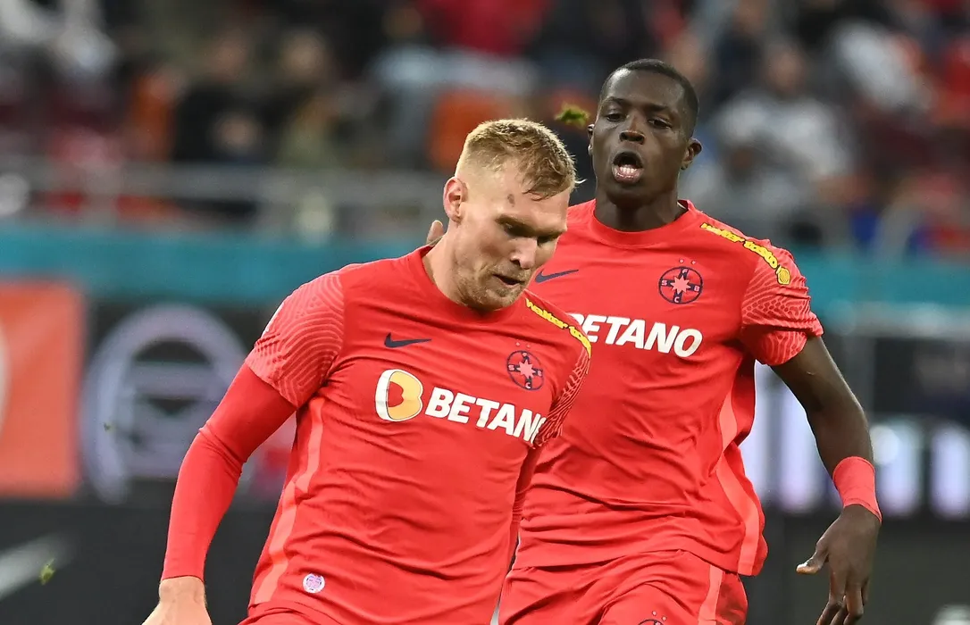 Joonas Tamm si Joyskim Aurelien Dawa Tchakonte in meciul de fotbal dintre FCSB si UTA Arad, contand pentru Superliga Superbet, desfasurat pe Arena Nationala din Bucuresti, duminica 16 octombrie 2022. © FOTO:Razvan Pasarica/SPORT PICTURES