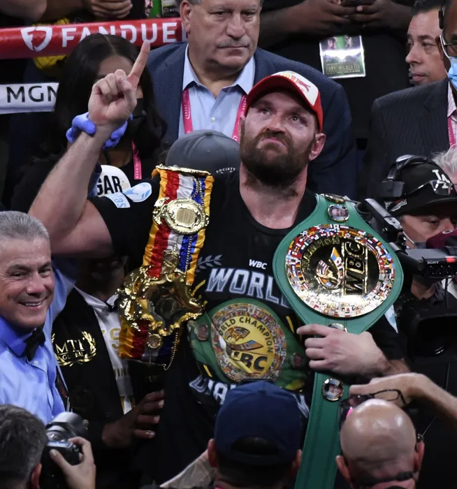 LAS VEGAS, NV - OCTOBER 09: Tyson Fury poses with his bells after knocking out Deontay Wilder in the 11th round for the World Heavyweight Championship III trilogy fight at T-Mobile Arena Saturday (Photo by MB Media/Getty Images)