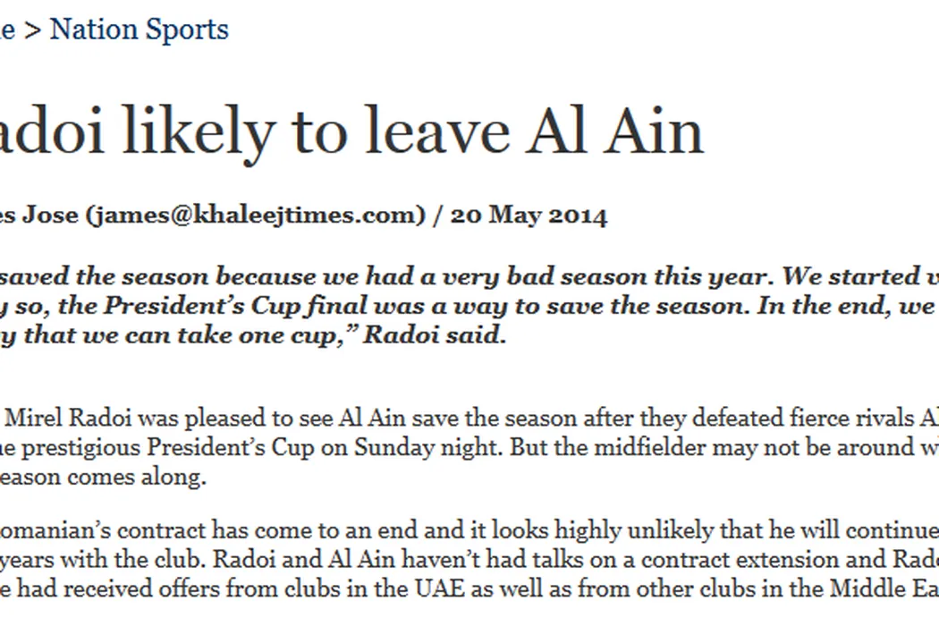 Rădoi se desparte de Al Ain. Fostul căpitan al Stelei nu se gândește la o revenire în Liga 1: „Am mai multe oferte din Golf”