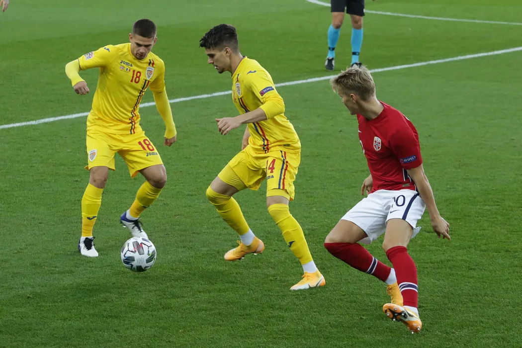 Razvan Marin si Ianis Hagi in meciul dintre Norvegia si Romania din Liga Natiunilor disputat pe stadionul Ullevaal din Oslo, duminica, 11 octombrie 2020. © FOTO: Sport Picture