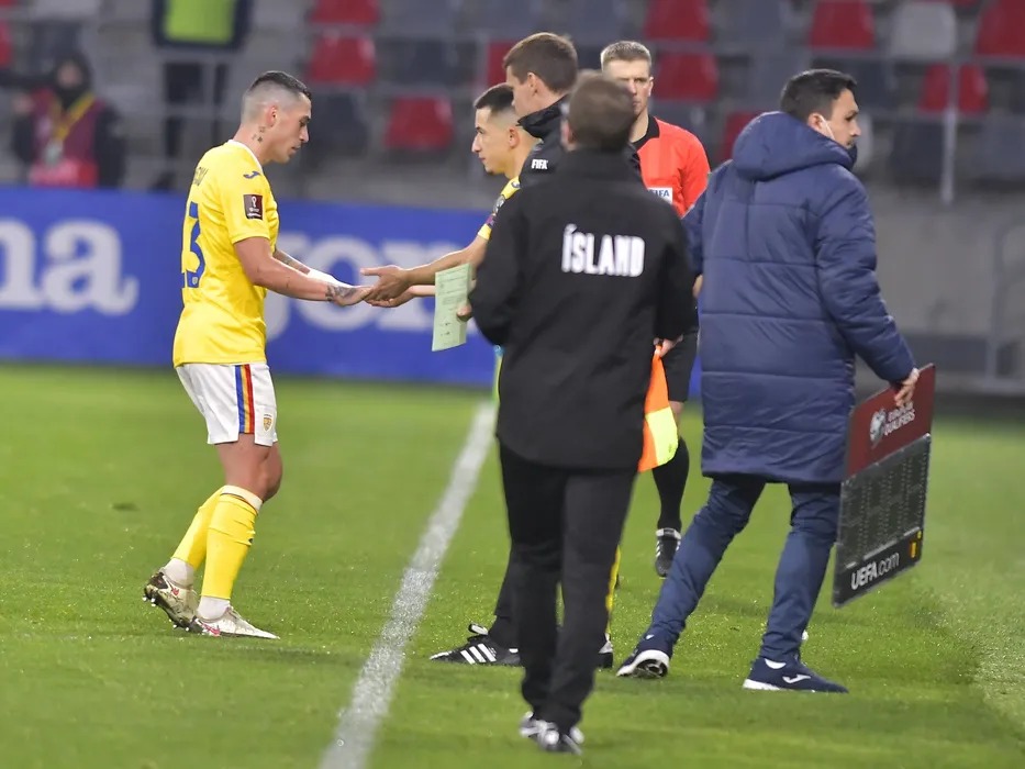 Olimpiu Moruţan il inlocuieste pe Nicolae Stanciu in meciul de fotbal dintre Romania si Islanda, din cadrul Preliminariilor Campionatului Mondial 2022, desfasurat pe Stadionul Steaua din Bucuresti, joi 11 noiembrie 2021. © FOTO:Razvan Pasarica/SPORT PICTURES