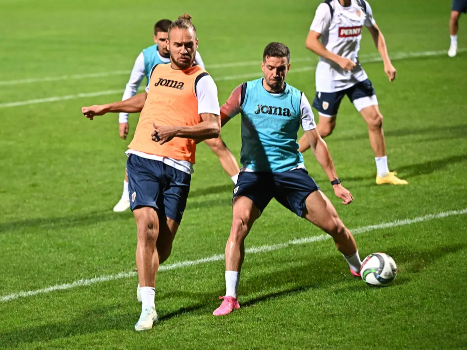 Fotbalistii romani George Puscas si Alexandru Chipciu la un antrenament efectuat inaintea meciurilor impotriva Ciprului si Lituaniei, din cadrul UEFA Nations League, desfasurat la Centrul National de Fotbal de la Mogosoaia, luni 7 octombrie 2024. © FOTO:Razvan Pasarica/SPORT PICTURES