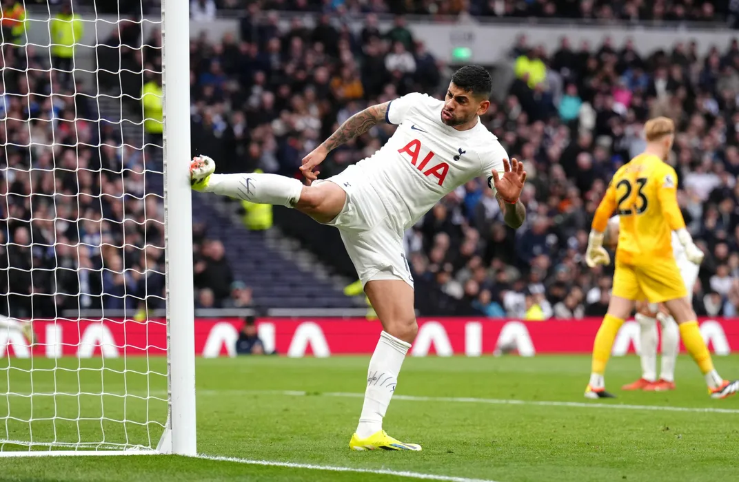 10 February 2024, United Kingdom, London: Tottenham Hotspur's Cristian Romero reacts to a missed opportunity by kicking the goal post during the English Premier League soccer match between Tottenham Hotspur and Brighton and Hove Albion at the Tottenham Hotspur Stadium. Photo: John Walton/PA Wire/dpa
