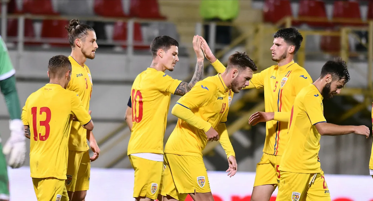 Bucurie a fotbalistilor romani cu Radu Dragusin, Dennis Man, Denis Harut, Tudor Baluta si Andrei Ciobanu in meciul de fotbal dintre Romania U21 si Malta U21, din cadrul Preliminariilor Campionatului European din 2021, desfasurat fara spectatori pe Stadionul Marin Anastasovici din Giurgiu, marti 13 octombrie 2020. © FOTO:Razvan Pasarica/SPORT PICTURES