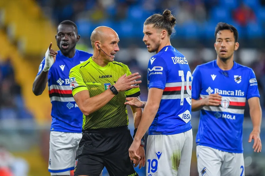 Luigi Ferraris stadium, Genova, Italy, October 22, 2021, OMAR COLLEY (Sampdoria), The Referee of the match Michael Fabbri of Ravenna, Radu Dragusin (Sampdoria) during UC Sampdoria vs Spezia Calcio - Italian football Serie A match,Image: 639999838, License: Royalty-free, Restrictions: , Model Release: no, Credit line: Profimedia