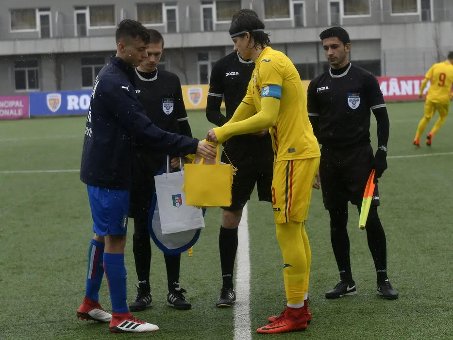 Gabriele Berto si Radu Dragusin la schimbul de fanioane in meciul amical de fotbal dintre Romania U16 si Italia U15, desfasurat pe terenul sintetic al Centrului National de fotbal de la Buftea, marti 13 martie 2018. © FOTO Razvan Pasarica/SPORT PICTURES