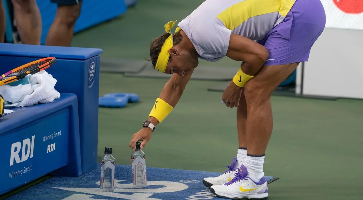 Aug 17, 2022; Cincinnati, OH, USA; Rafael Nadal (ESP) lines up his water bottles before his match against Borna Coric (CRO) at the Western & Southern Open at the at the Lindner Family Tennis Center.,Image: 714747316, License: Rights-managed, Restrictions: *** World Rights ***, Model Release: no