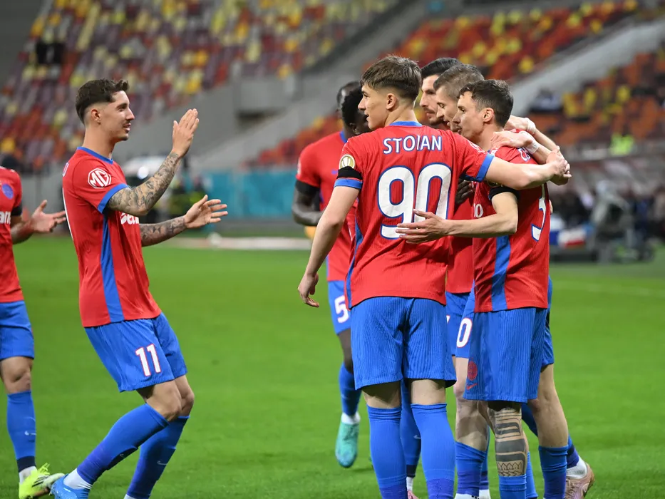 Fotbalistii ros-albastrii David Raul Miculescu, Mihai Popescu, Alexandru Constantin Stoian, Florin Lucian Tănase si Juri Cisotti se bucura dupa un gol marcat in meciul dintre FCSB si Otelul Galati, contand pentru Play out-ul Superligii Superbet, desfasurat pe Arena Nationala din Bucuresti, sambata 11 aprilie 2026. © FOTO:Razvan Pasarica/SPORT PICTURES