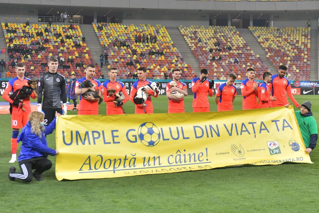 Fotbalistii stelisti la startul meciului de fotbal dintre FCSB si FC Voluntari, contand pentru Liga 1 Casa Pariurilor, desfasurat pe Arena Nationala din Bucuresti, duminica 6 martie 2022. © FOTO:Razvan Pasarica/SPORT PICTURES