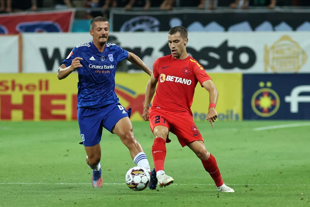 Vlad Achim (S), de la FC U Craiova, lupta pentru balon cu Darius Olaru (D), de la FCSB, in meciul de fotbal din etapa a III-a a Superligii, disputat pe Arena Nationala din Bucuresti, duminica, 31 iulie 2022. GEORGE FILIP / MEDIAFAX FOTO