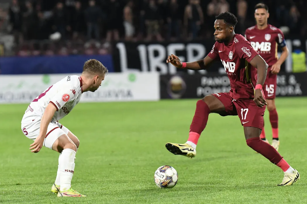 Philip Porwei Otele și Phillipe Răzvan Onea în meciul de fotbal dintre FC CFR 1907 Cluj si FC Rapid 1923 București, contând pentru Superliga Superbet Play-Off, desfășurat pe Stadionul Dr.Constantin Rădulescu din Cluj-Napoca, duminică 5 mai 2024. © FOTO: Flaviu BUBOI/SPORT PICTURES