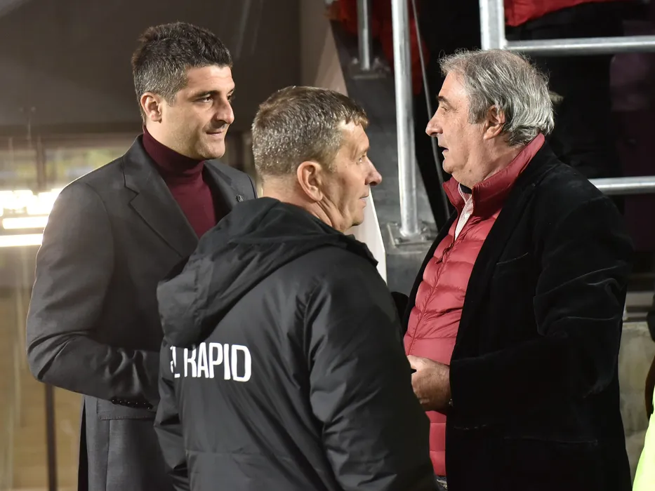 Daniel Niculae discuta cu Mihai Stoichita la meciul de fotbal dintre Rapid Bucuresti si FC Botosani, contand pentru Play-out-ul Ligii 1 Casa Pariurilor, desfasurat pe Stadionul Rapid Giulesti din Bucuresti, sambata 2 aprilie 2022. © FOTO:Razvan Pasarica/SPORT PICTURES