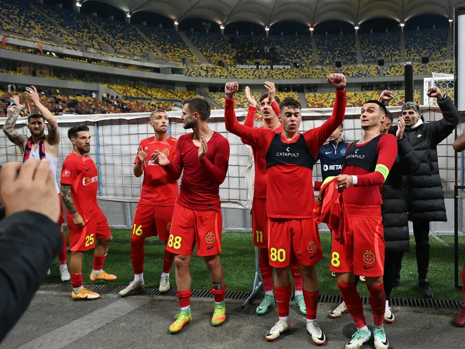 Fotbalistii stelisti Ovidiu Marian Popescu, Alexandru Mihail Baluta, Mihai Daniel Lixandru, Damjan Djokovic, Damjan Djokovic,Eduard Gabriel Radaslavescu,Adrian Gheorghe Sut si Florinel Teodor Coman saluta galeria dupa meciul de fotbal dintre FCSB si FC U Craiova, din cadrul Superligii Superbet, desfasurat pe Arena Nationala din Bucuresti, duminica 12 noiembrie 2023. © FOTO:Razvan Pasarica/SPORT PICTURES