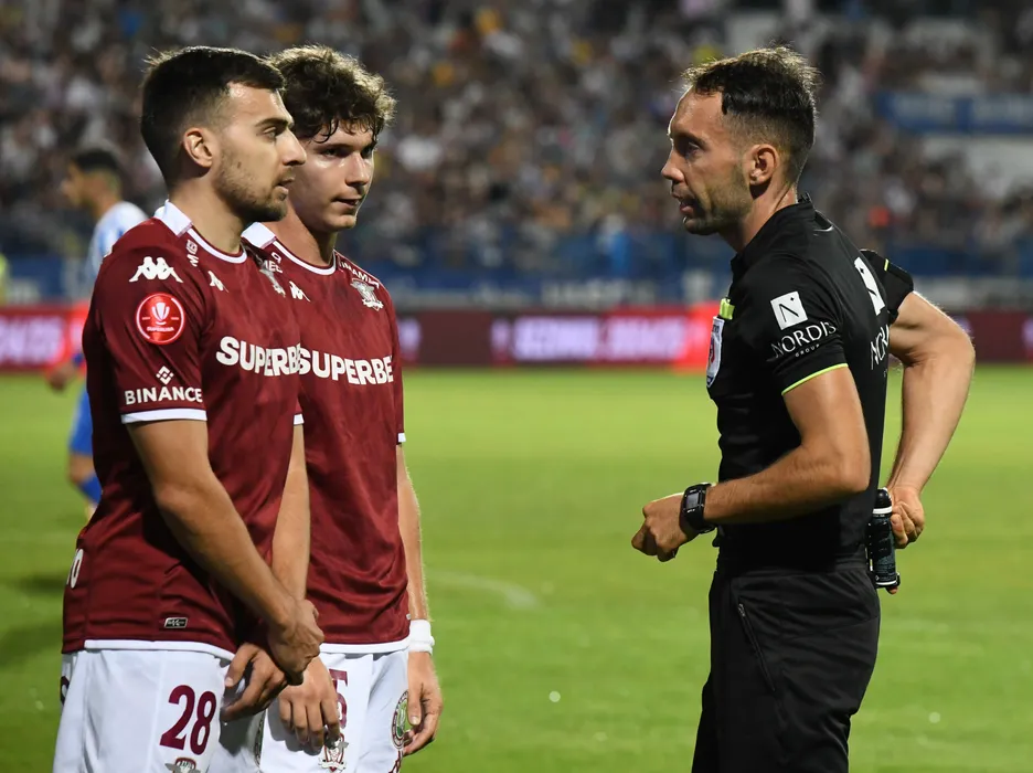 Arbitrul central George Cătălin Găman și Luka Gojkovic, Rareș Mihai Pop în meciul de fotbal dintre Poli Iași si FC Rapid 1923 București, contând pentru SuperLiga Superbet, desfășurat pe Stadionul Emil Alexandrescu din Iași, vineri 23 august 2024. © FOTO: Tudi/SPORT PICTURES