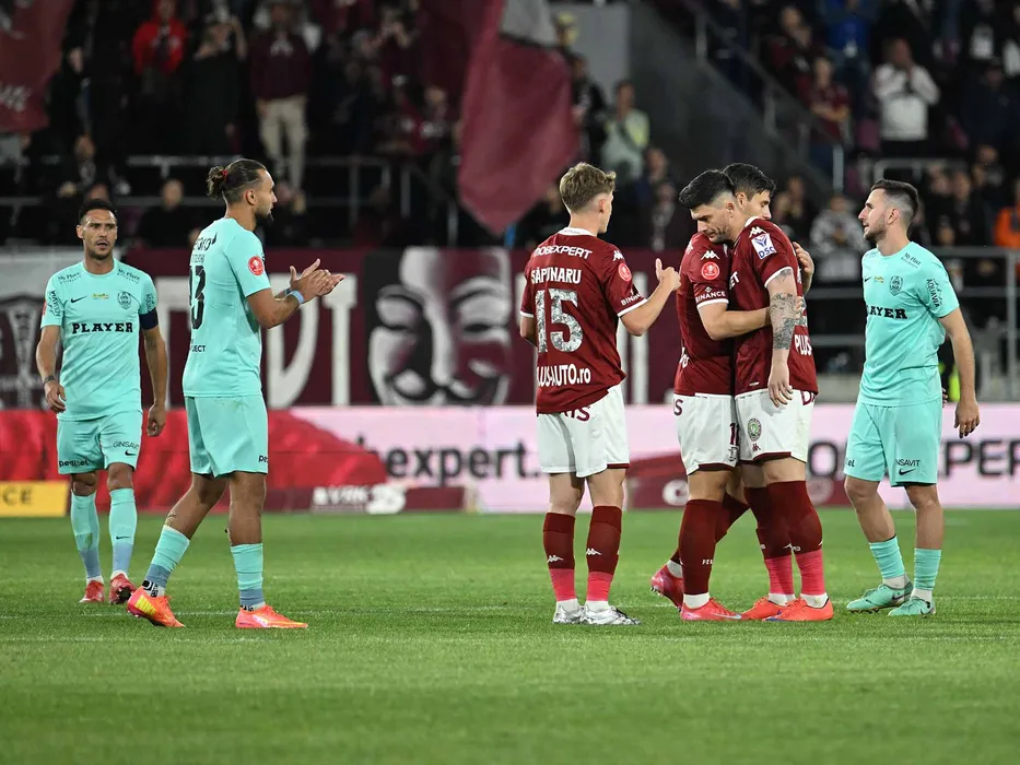 Cristian Ionuț Săpunaru felicitat de Mario Camora (Malico Paulino Mario Jorge), Virgiliu Postolachi, Cătălin Alin Vulturar, Borisav Burmaz si Constantin Adrian Păun la iesirea ultima data de pe teren la meciul de fotbal dintre Rapid Bucuresti si CFR Cluj, din cadrul Play off-ului Superligii Superbet, desfasurat pe Superbet Arena Giulesti din Bucuresti, luni 19 mai 2025. © FOTO:Razvan Pasarica/SPORT PICTURES