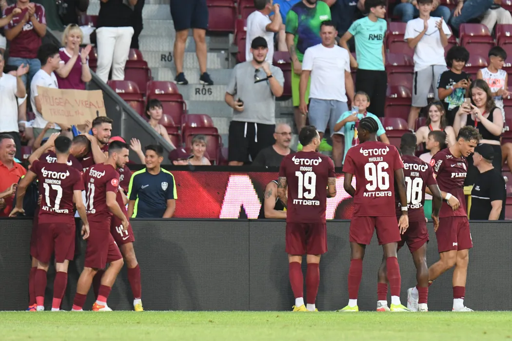 Bucurie a fotbaliștilor ceferiști după un gol marcat în meciul de fotbal dintre FC CFR 1907 Cluj si Dinamo București, contând pentru Superliga Superbet, desfășurat pe Stadionul Dr.Constantin Rădulescu din Cluj-Napoca, duminică 14 iulie 2024. © FOTO: Flaviu BUBOI/SPORT PICTURES