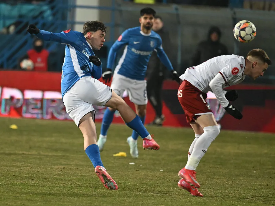 Eduard Gabriel Radaslavescu si Claudiu Adrian Mihai Petrila in meciul de fotbal dintre Farul Constanta si Rapid Bucuresti, contand pentru Superliga Superbet, desfasurat pe Stadionul central al Academiei Gheorghe Hagi din Ovidiu, luni 24 februarie 2025. © FOTO:Razvan Pasarica/SPORT PICTURES