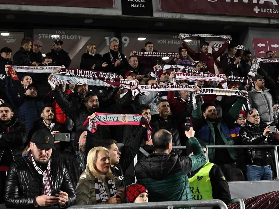 Suporterii rapidisti cu fularele si esarfele deasupra capetelor la meciul de fotbal dintre Rapid Bucuresti si Farul Constanta, din cadrul Play-off-ului Superligii Superbet, desfasurat pe Superbet Arena-Giulesti din Bucuresti, vineri 15 martie 2024. © FOTO:Razvan Pasarica/SPORT PICTURES