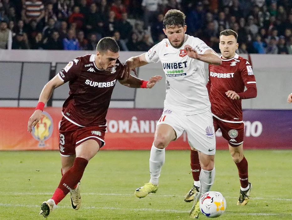 Sergiu Florin Bus si Denis Ciobotariu, Luka Gojkovic in meciul de fotbal dintre AFC Hermannstadt Sibiu si FC Rapid 1923 Bucuresti, contand pentru semifinala Cupei Romaniei Betano, desfasurat pe Stadionul Municipal din Sibiu, miercuri 23 aprilie 2025. © FOTO: Valentin Macrea/SPORT PICTURES