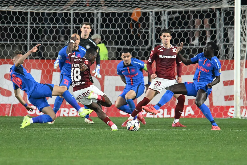 Mihai Daniel Lixandru, Abdul Kader Keita, Mihai Alexandru Dobre si Baba Alhassan in meciul de fotbal dintre Rapid Bucuresti si FCSB, din cadrul Play off-ului Superligii Superbet, desfasurat pe Superbet Arena Giulesti din Bucuresti, luni 27 aprilie 2025. © FOTO:Razvan Pasarica/SPORT PICTURES