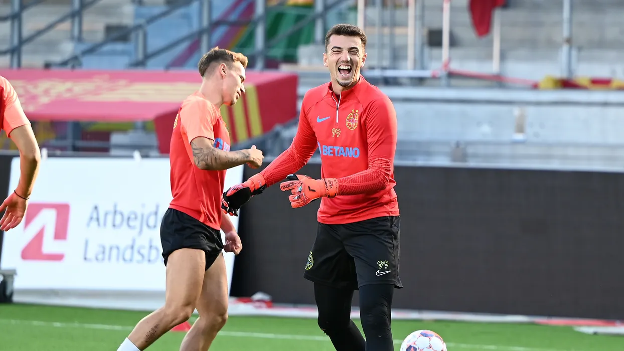 Fotbalistii de la FCSB Grigoras Alexandru Pantea si Andrei Daniel Vlad la antrenamentul oficial de dinaintea meciului impotriva lui FC Nordsjælland, din cadrul UEFA Europa Conference League, desfasurat pe Stadionul Right to Dream Park din Farum, miercuri 16 august 2023. © FOTO:Razvan Pasarica/SPORT PICTURES