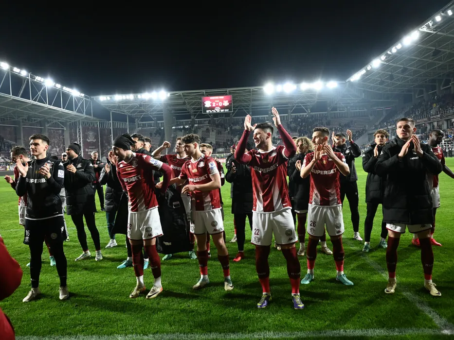 Fotbalistii rapidisti Marian Mihai Aioani, Alexandru Cristian Albu, Paul Alexandru Iacob, Sebastian Andrei Borza, Cristian Ionut Sapunaru, Razvan Constantin Oaida si Ermal Krasniqi saluta galeria dupa meciul de fotbal dintre Rapid Bucuresti si FC Hermanstadt, din cadrul Superligii Superbet, desfasurat pe Superbet Arena-Giulesti din Bucuresti, vineri 16 februarie 2024. © FOTO:Razvan Pasarica/SPORT PICTURES