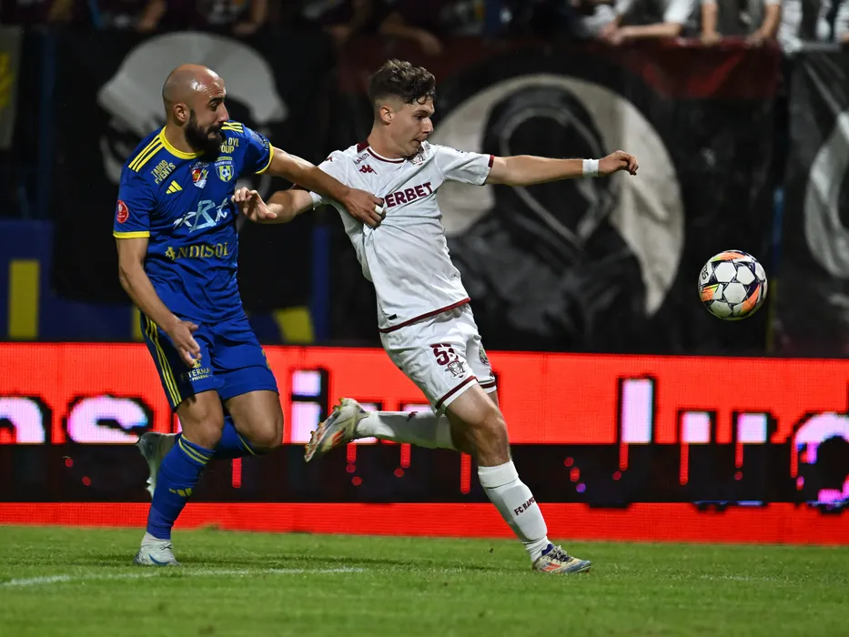 Rareș Mihai Pop marchează un gol de lângă Daniel Marius Serbanica in meciul dintre Unirea Slobozia si Rapid Bucuresti, contand pentru Superliga Superbet, desfasurat pe Clinceni Arena din Clinceni, luni 23 septembrie 2024. © FOTO:Razvan Pasarica/SPORT PICTURES