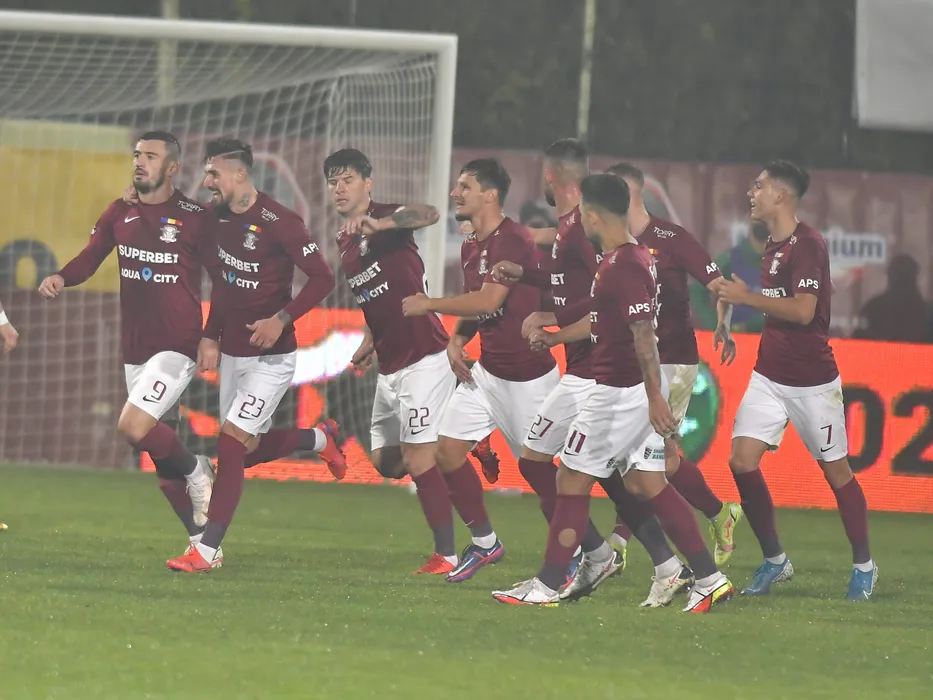 Bucurie a fotbalistilor rapidisti dupa un gol marcat cu Adrian Ionut Balan, Alexandru Cristian Albu, Cristian Ionut Sapunaru, Ljuban Crepulja si Antonio Valentin Sefer in meciul de fotbal dintre Rapid Bucuresti si CFR Cluj, contand pentru Liga 1 Casa Pariurilor, desfasurat pe Stadionul Orasenesc din Mioveni, duminica 17 octombrie 2021. © FOTO:Razvan Pasarica/SPORT PICTURES