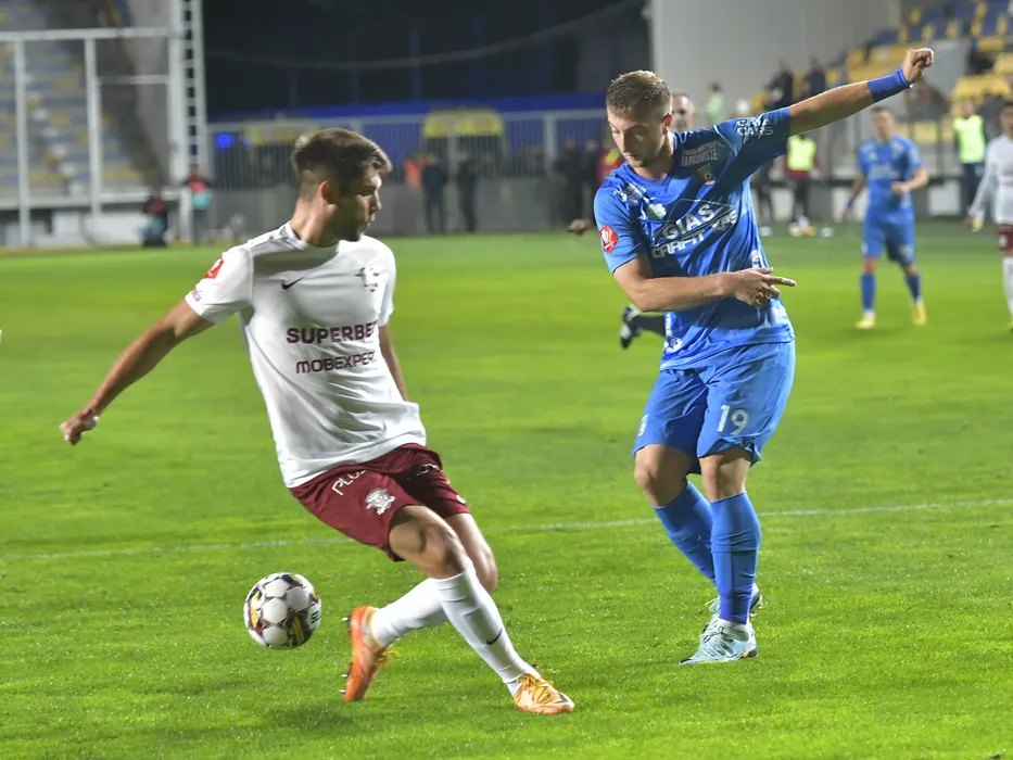 Paul Alexandru Iacob si Iliuta Daniel Popa in meciul de fotbal dintre Chindia Targoviste si Rapid Bucuresti, contand pentru Superliga Superbet, desfasurat pe Stadionul Ilie Oana din Ploiesti, luni 3 octombrie 2022. © FOTO:Razvan Pasarica/SPORT PICTURES