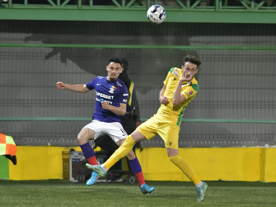 Nicolae Carnat si Razvan Alin Trif in meciul de fotbal dintre CS Mioveni si Rapid Bucuresti, contand pentru Play-out-ul Ligii 1 Casa Pariurilor, desfasurat pe Stadionul Orasenesc din Mioveni, luni 16 mai 2022. © FOTO:Razvan Pasarica/SPORT PICTURES