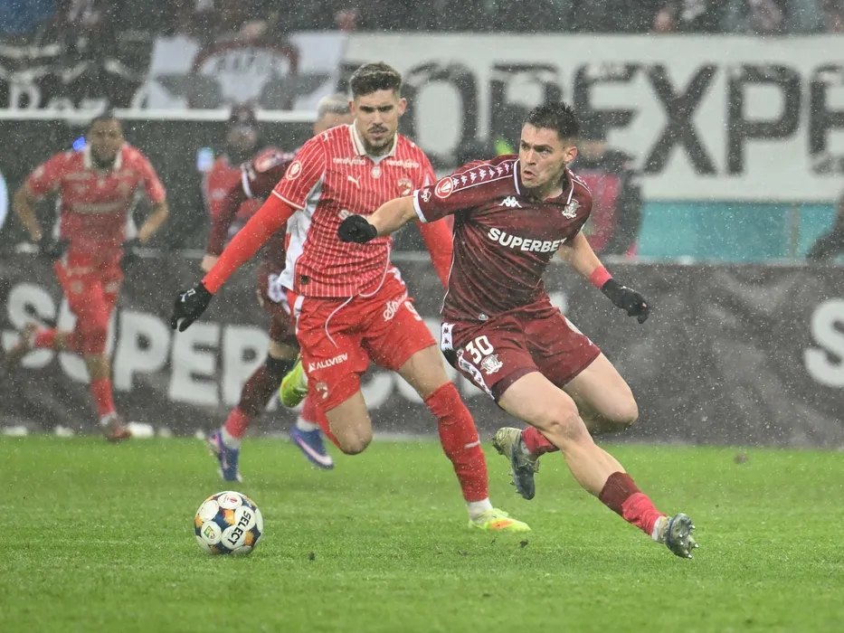 Iulius Andrei Marginean si George Daniel Paraschiv in meciul de fotbal dintre Rapid Bucuresti si Dinamo Bucuresti, din cadrul Superligii Superbet, desfasurat pe Arena Nationala din Bucuresti, sambata 21 februarie 2026. © FOTO:Razvan Pasarica/SPORT PICTURES