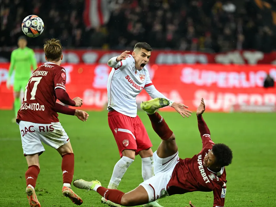 Clinton Mua Njie si Catalin Ionut Cirjan in meciul dintre Rapid Bucuresti si Dinamo Bucuresti, contand pentru Play off-ul Superligii Superbet, desfasurat pe Arena Nationala din Bucuresti, duminica 6 aprilie 2025. © FOTO:Razvan Pasarica/SPORT PICTURES