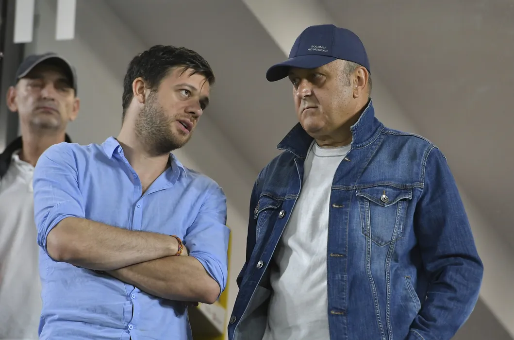 Victor Angelescu si Dan Sucu discuta in tribuna la meciul de fotbal dintre Romania si Muntenegru, contand pentru Liga Natiunilor, desfasurat pe Stadionul Rapid Giulesti din Bucuresti, marti 14 iunie 2022. © FOTO:Razvan Pasarica/SPORT PICTURES