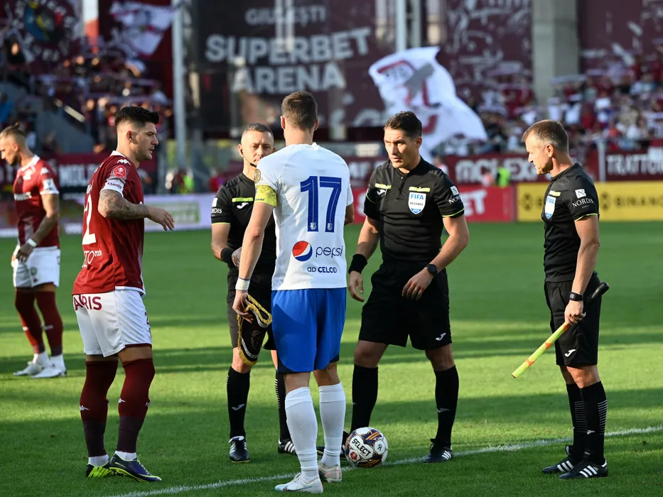 Brigada de arbitrii formata din Vasile Marinescu, Istvan Kovacs si Ovidiu Artene alaturi de capitanii Cristian Ionut Sapunaru si Ionut Justinian Larie in meciul de fotbal dintre Rapid Bucuresti si Farul Constanta, din cadrul Superligii Superbet, desfasurat pe Superbet Arena-Giulesti din Bucuresti, duminica 20 august 2023. © FOTO:Razvan Pasarica/SPORT PICTURES