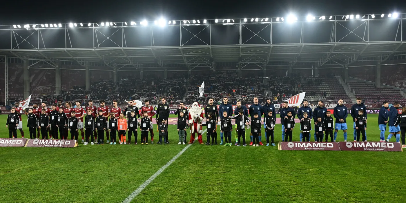 Fotbalistii celor doua echipe alaturi de brigada de arbitri insotiti de Mos Craciun la startul meciului de fotbal dintre Rapid Bucuresti si FC Voluntari, din cadrul Superligii Superbet, desfasurat pe Superbet Arena-Giulesti din Bucuresti, sambata 9 decembrie 2023. © FOTO:Razvan Pasarica/SPORT PICTURES